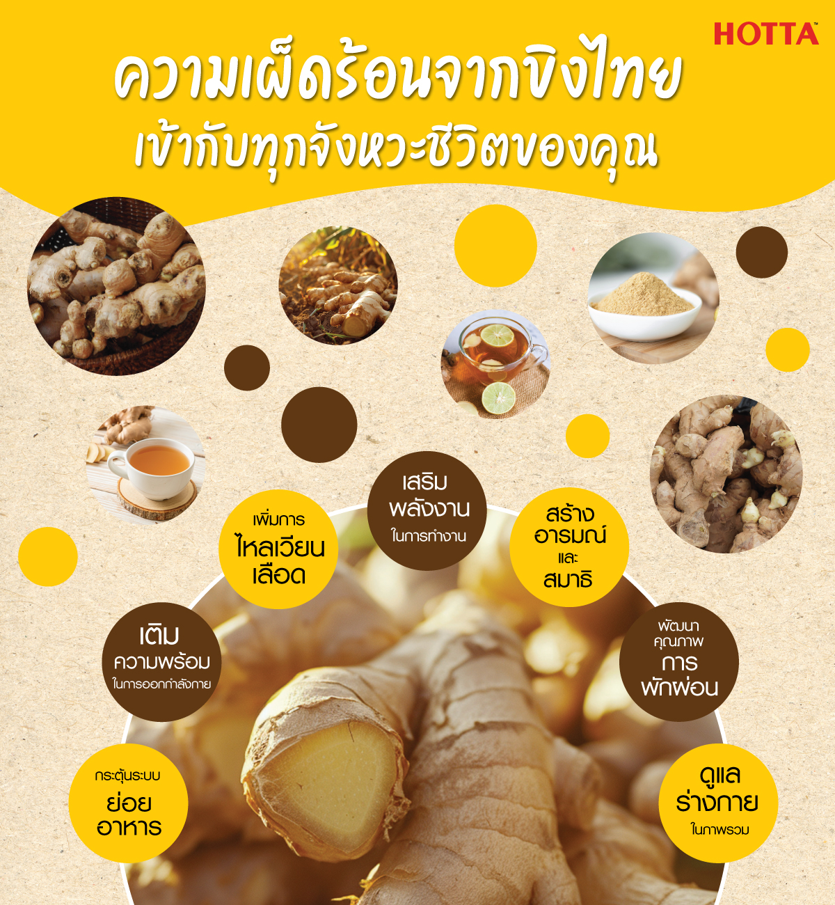 ความเผ็ดอุ่นของน้ำขิง ไม่ได้ให้แค่รสชาติที่โดดเด่น แต่ยังช่วยปรับจังหวะชีวิตของเราให้สมดุล from morning routines ถึงการพักผ่อนยามค่ำคืน ผ่านคุณประโยชน์ที่ช่วยให้ร่างกายไหลเวียนดีขึ้น และส่งผลต่อสุขภาพองค์รวมในทุกมิติ “ความเผ็ดร้อนจากน้ำขิงไทย ที่หลอมรวมทุกจังหวะชีวิตให้ไหลลื่น” มีดังนี้