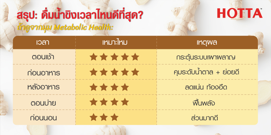 A: ดื่มก่อน หรือพร้อมอาหาร เหมาะที่สุด เพราะ ช่วยกระตุ้นเอนไซม์ย่อยอาหาร ลดอาการแน่น ท้องอืด ช่วยให้การดูดซึมสารอาหารดีขึ้น อาจช่วยลดการพุ่งของน้ำตาลหลังอาหาร สนับสนุนระบบเผาผลาญโดยรวม ในแนวคิด Metabolic Health การควบคุมระดับน้ำตาลหลังมื้ออาหาร (post-meal glucose spike) คือหัวใจสำคัญ และน้ำขิงสามารถเป็นตัวช่วยทางธรรมชาติในจุดนี้